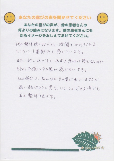 整体院 海癒に来院して下さったお客様の感想・喜びの声を集めました。痛みがなくなった、楽になったという声を聞くのは嬉しいものです。あなたと似た症状の方もいらっしゃるかもしれません。